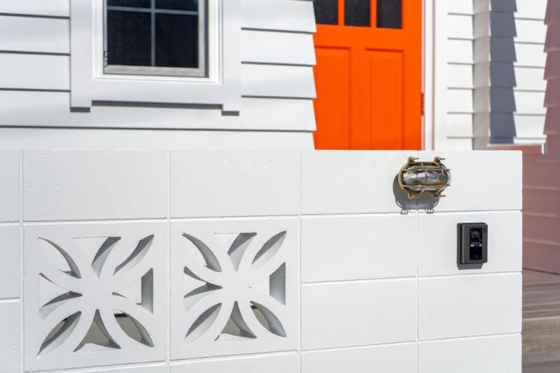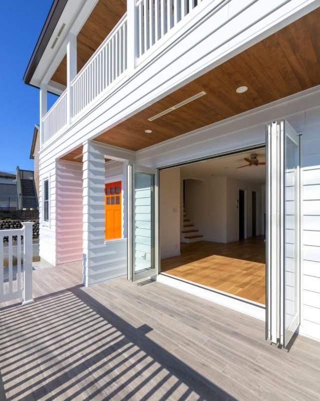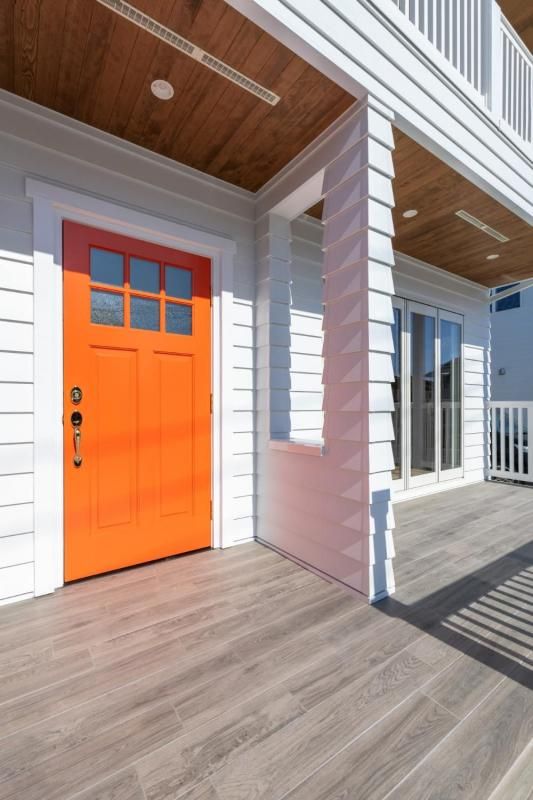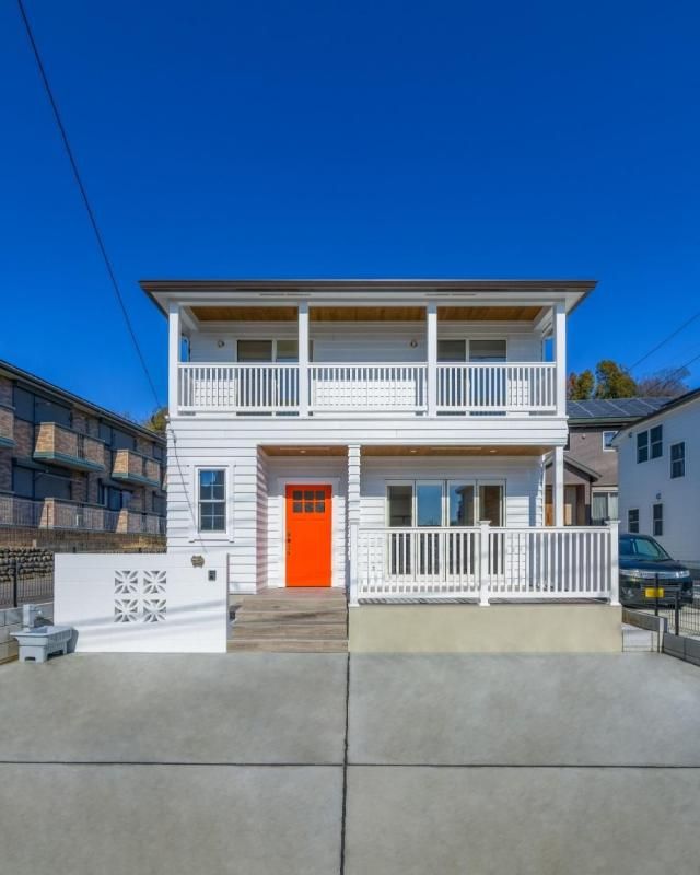 鮮やかなオレンジ色の輸入玄関ドアが印象的な